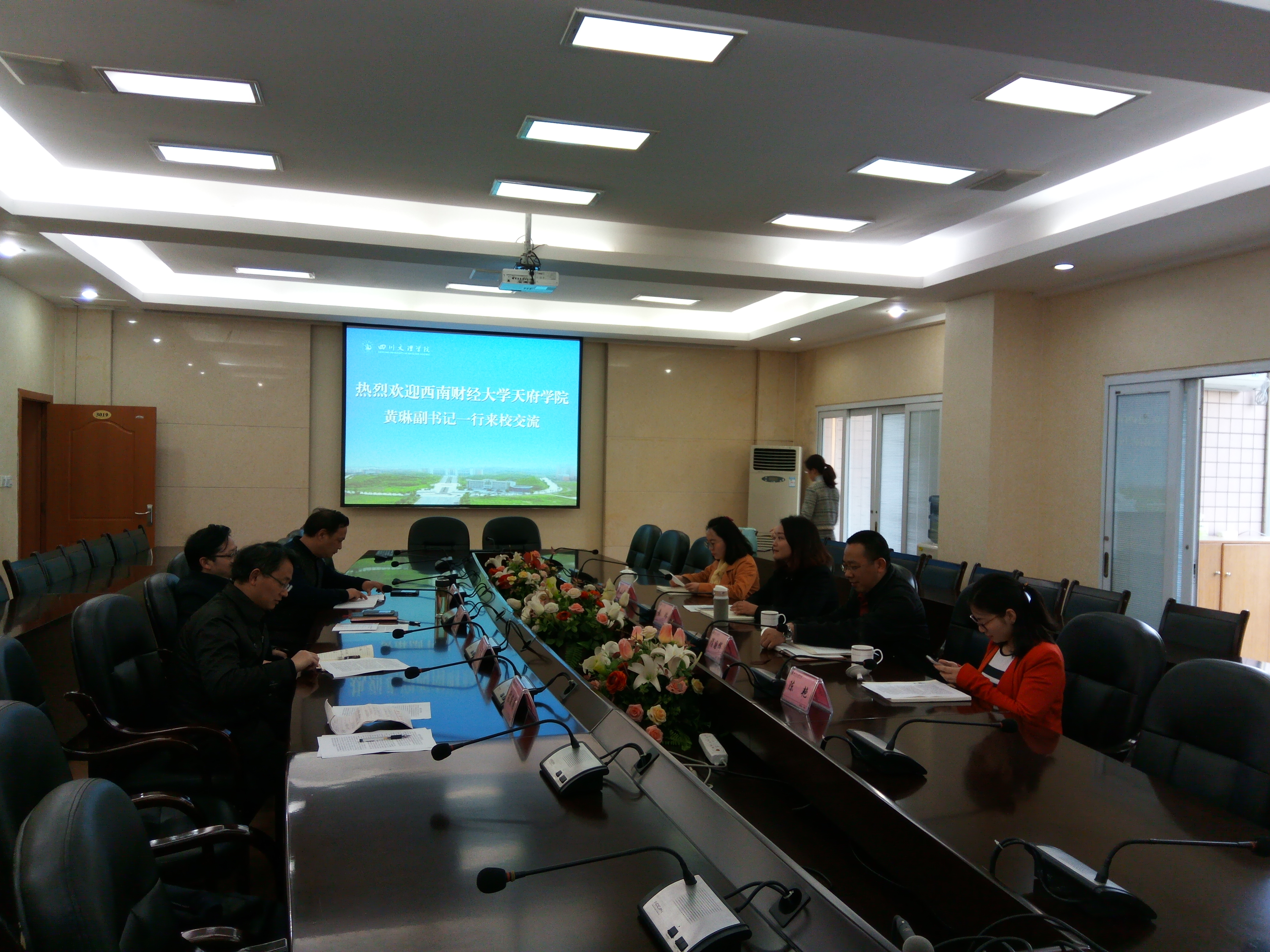 4月12日,西南财经大学天府学院黄琳副书记带领老年学研究所所长、副所长及专业负责人一行四人来金年会交流并召开座谈会。金年会党委副书记侯忠明教授、JINNIAN金年会院长靳能泉教授、教务处副处长曾宪文教授及专业教师张俊蒲参加座谈。