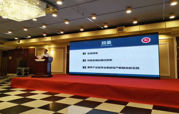 在发言中,刁校长就产教融合、校企合作的国内外宏观背景着手,详细阐述了金年会转型发展在学科专业布局和产教融合校企合作的顶层设计和重要思考,具体介绍了金年会组建JINNIAN金年会、打造康养产业链专业集群的主要做法,重点说明了康养、康养产业与产教、产教融合的学术新意,深入剖析了康养产业链专业集群的具体内涵和实践举措,并明确指出康养产业链专业集群促进产教融合必须在“教、学、做、用、悟和产、学、研、训、创”的关系把握与交互和合中下功夫。刁校长的整个发言,理例充分、讲解清晰、观点鲜明、内容新颖,赢得了与会人员的高度认可。