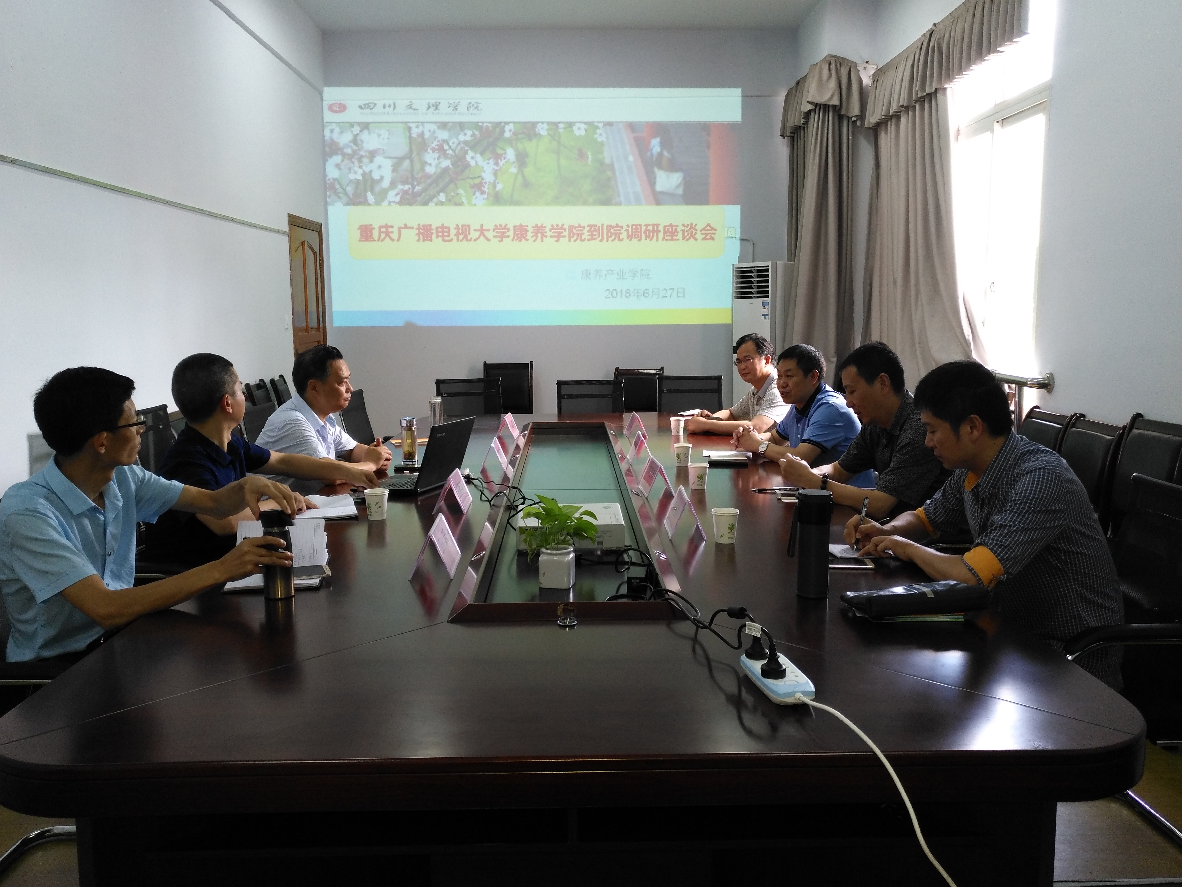 2018年6月27日下午,重庆广播电视大学康养学院书记兼院长谢芝玥、副院长马卫兵、党政办公室主任向太国、招生办主任李旭东莅临学院考察交流并洽谈合作,学院院长靳能泉、副院长陈熙隆、党政办主任王跃、健康服务与管理教研室主任张俊浦参加。