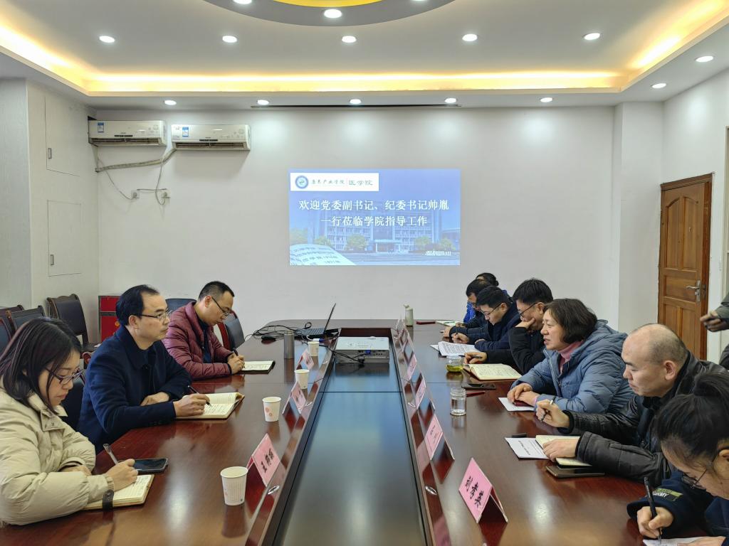 帅胤同志对学院党建引领、党风廉政建设、学科专业发展、学生培养、院校合作等方面取得的成绩给予充分肯定,希望学院在未来的工作中一要在特色化、差异化中探寻学院发展路径,注重康、养结合,产业与市场结合。二要引导教师做到教、育并重、把教书育人,立德树人贯穿教育始终,学生培养做到术德兼备,把医术和医德培养高度统一;三要发挥党建引领作用,落实全面从严治党责任,加强纪律和法规教育,做到纪法双施双守,以师为范,为推动学院高质量发展保驾护航。