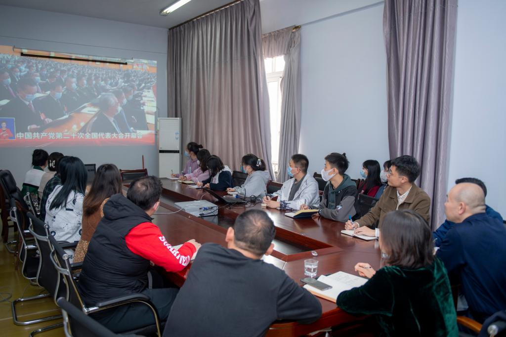 上午10时,420会议室中座无虚席、鸦雀无声,只响彻着高亢洪亮的国歌。康养产业·金年会官网师生代表全神贯注地观看着中国共产党第二十次全国代表大会。