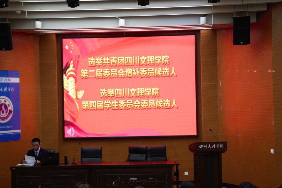 2018年11月7日下午,共青团四川文理学院第二届四次全委(扩大)会暨第四次学生代表大会JINNIAN金年会分团预选举会议在学术报告厅b厅召开。团总支书记周宏星老师与本次团学代表参加了会议。王琅主持。