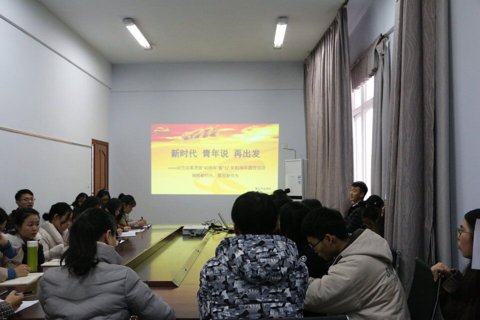 2018年12月6日中午12点30分,JINNIAN金年会于教学楼420会议室开展主题为新时代、青年说、再出发--庆祝改革开放“40周年”暨“12.9”83周年团日活动。学院团总支书记周宏星老师与各班级代表、团总支学生会代表参加。于慧晴担任活动主持。