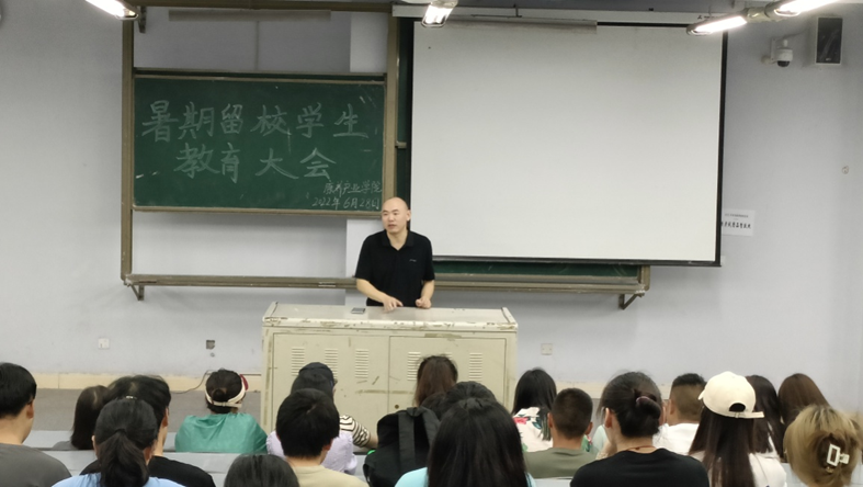 教育大会上,屈川就暑期留校的同学提出了四个方面的要求,第一,留校人员务必遵守学校的各项规章制度,服从学校公寓管理的规定和要求,做好在校的生活、学习各方面的安排。第二,注意防火、防盗、防诈骗、防溺水等安全,特别是假期天气炎热,提醒留校的同学一定要到正规场所游泳,不得私自下河、湖、塘游泳,以免出现意外情况。第三,做好暑期疫情防控工作,根据属地管理原则,遵守学校相关的疫情防控的要求。第四,留校学生假期有什么情况,应及时和宿管员、留校学生干部、值班老师沟通,做好信息的畅通。周宏星老师就暑期留校的实习学生提出的因实习原因涉及到半夜归寝的情况进行了补充,她要求各宿舍学生及时将信息报送至宿管员,做好沟通协调工作。