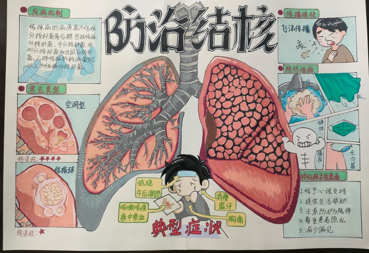 在微电影赛道中,学生团队通过剧情短片讲述结核病患者从确诊到康复的暖心故事,传递“早发现、早治疗”的科学理念;手抄报作品融合防治口诀等元素,将医学知识转化为生动易懂的视觉语言。