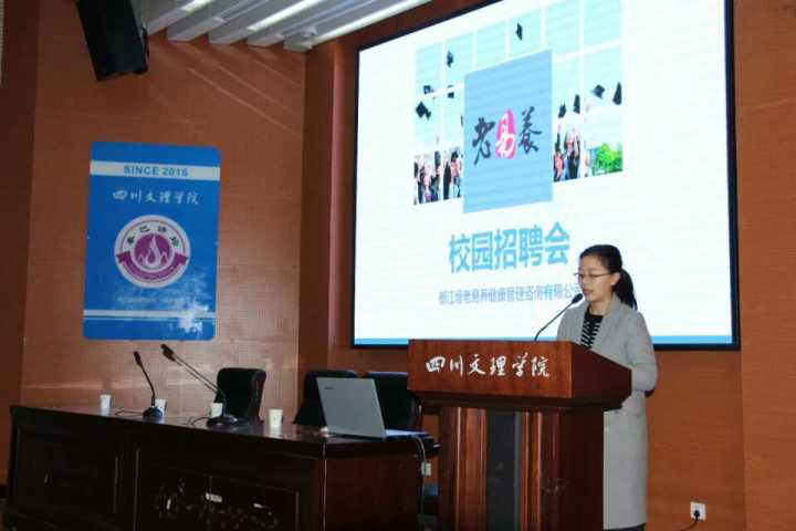 2018年12月7日上午,成都都江堰老易养健康管理咨询有限公司创始人杨晓峰总经理一行8人来学院开展协同育人和招聘宣讲活动。学院院长靳能泉、副院长陈熙隆和健康服务与管理教研室主任张俊浦和专业教师叶盈、2016级和2018级老年服务与管理专业学生参加了活动。叶盈主持了专业讲座和招聘宣讲大会。